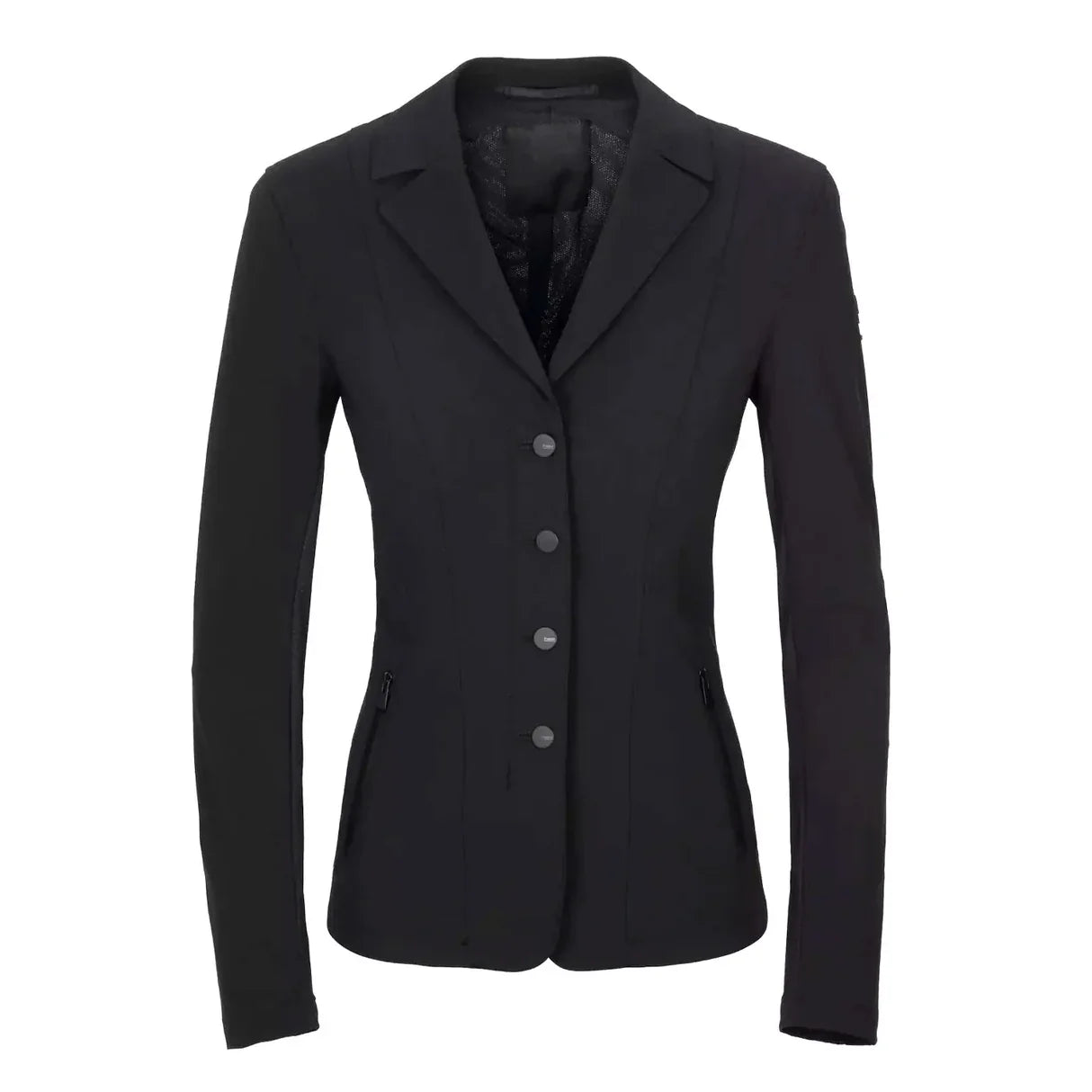 The Pikeur Talia show jacket combines classic styling with modern features. This gorgeous jacket has mesh panels along the sides of the body and back to keep you cool in the summer heat, without showing your show shirt underneath.