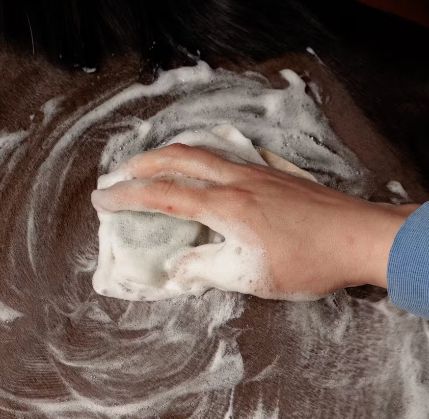 Place the Shampoo Bar in a foam net and wet it thoroughly, along with the horse's coat. Massage the Shampoo Bar across the horse’s body, using the foam net to create a rich lather and gently scrub. Rinse thoroughly with water.